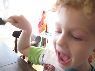 The very nice older lady under the blow dryer kept telling the stylist, "don't cut too much!  He's still little!"  Thereby lifting the burden of anxiety over whether my baby would be utterly shorn from my shoulders, since she had it covered for me.  In the end, Daddy actually couldn't figure out that he'd had a haircut until he was told.  So he looks tidy, and cute, and not at all drastically different.  What a relief.